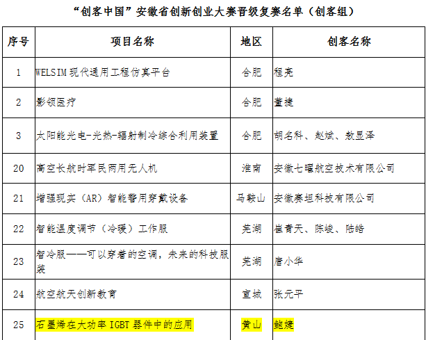 经过专家组对初赛阶段项目初审打分,择优选出50个项目(企业组25个,创客组25个)进入复赛,园区企业黄山宝霓二维新材科技有限公司的“石墨烯在大功率IGBT器件中的应用”项目作为创客组成功晋级复赛。