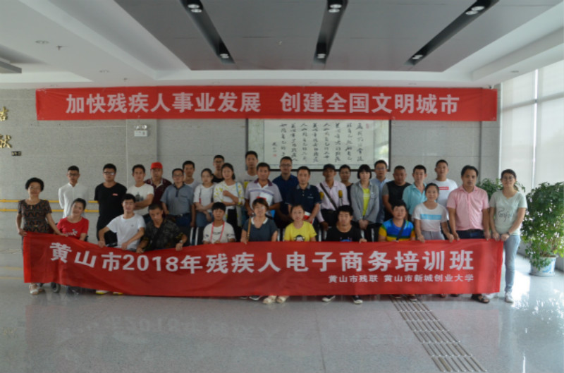 2018年7月,黄山市新城创业大学与黄山市残联联合开办了2018年黄山市残疾人网络创业(电子商务)培训班。黄山市新城创业大学是安徽省首批省级创业大学,是黄山市人社局认定的创业培训定点机构。创业大学开班的创业培训邀请国家人社部培训讲师为残疾人讲授电子商务技能,授课内容包括图片美工、商品货源管理、店铺装修、店铺推广等方面。让学员掌握电商技能,通过系统的学习,让学员学得一技之长,扩大了创业就业门路。