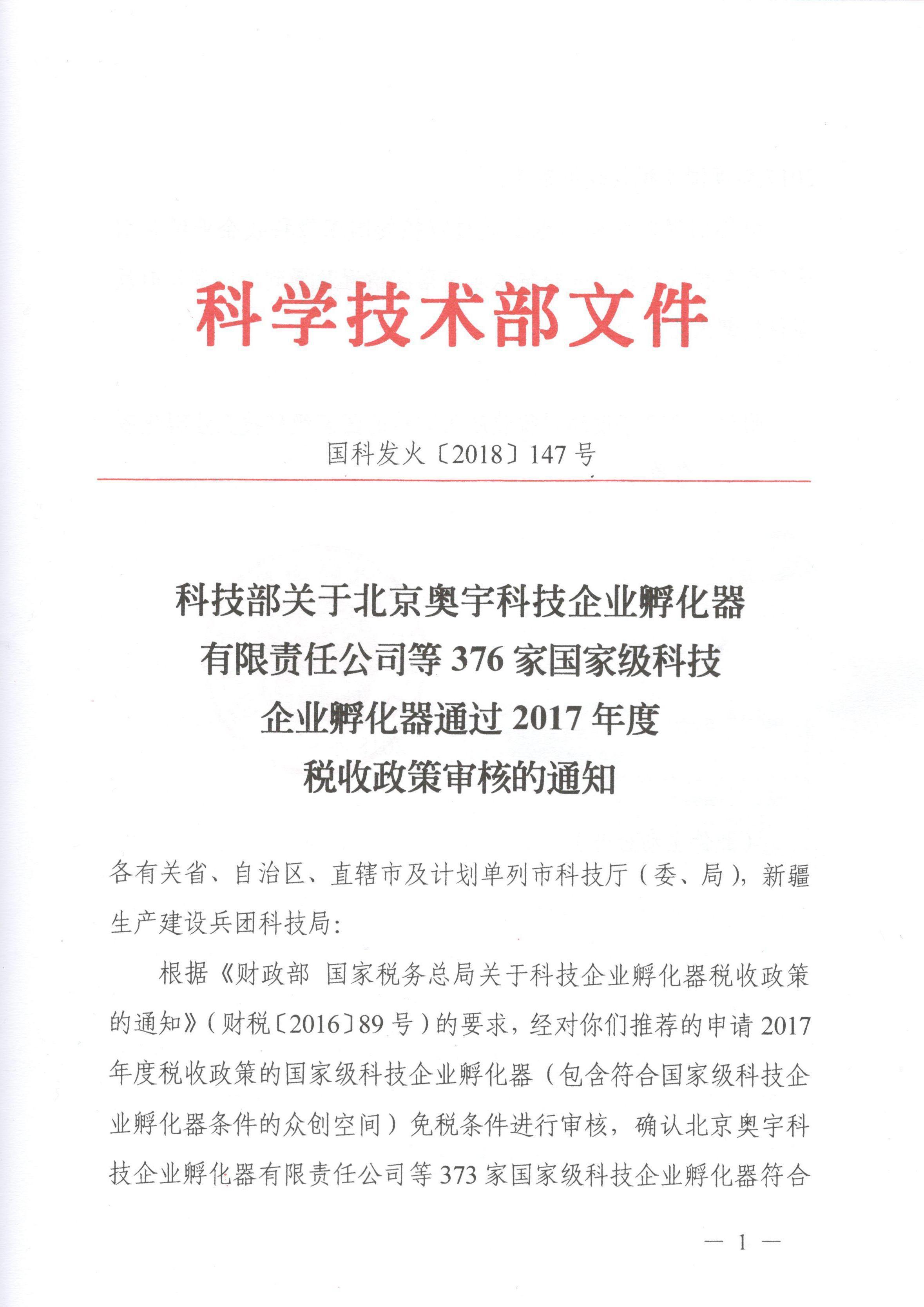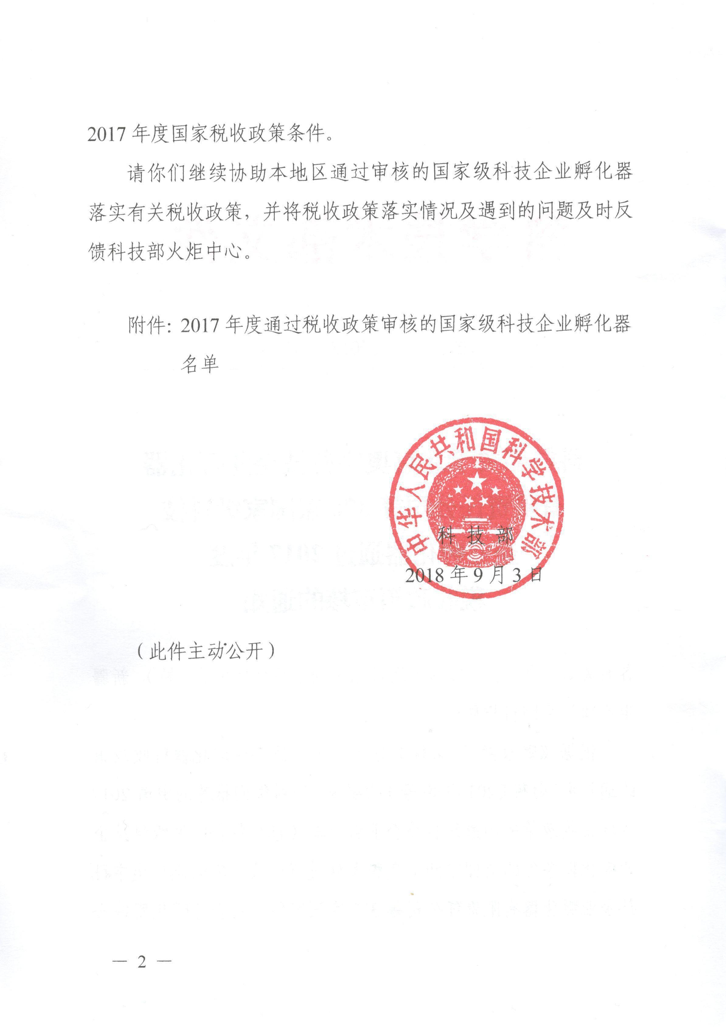 按照《财政部 国家税务总局关于科技企业孵化器税收政策的通知》(财税[2016]86号)的要求,科技部经过对2017年度国家级科技企业孵化器免税条件进行审核,最终确认376家符合条件享受2017年度国家税收优惠政策。
