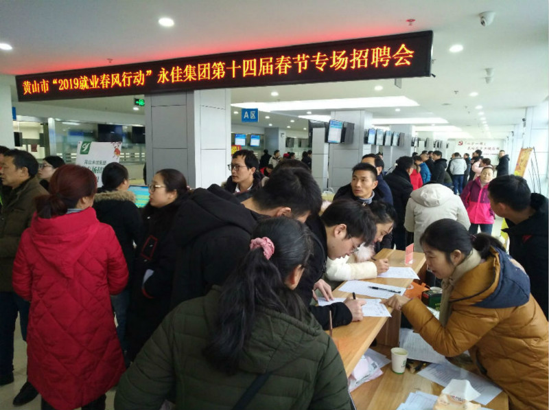 2019年2月9日(正月初五),黄山市“2019就业春风行动”——永佳集团第十四届春节专场招聘会在市人力资源市场二楼服务中心大厅举行。黄山科创组织园区风腾自动化、普视达电子等企业参加招聘会。