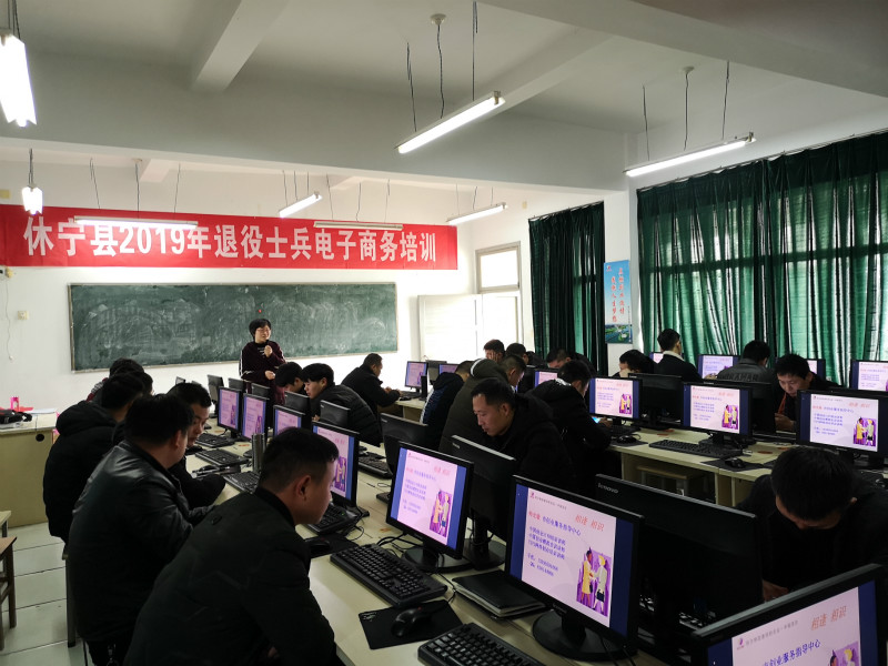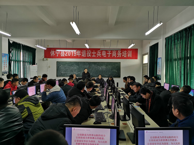 继2018年休宁县第一期退役士兵网络创业培训成功举行并取得良好效果之后,为进一步提升退役士兵综合素质,增强创业能力,鼓励自主创业、自谋职业,2019年3月11日,黄山市新城创业大学承办的2019年退役士兵网络创业(电商)培训班在休宁县徽匠学校开班。休宁县退役军人事务管理局方敏志副局长、休宁人社局职业能力建设股洪清和股长、休宁徽匠学校徐雪峰副校长、培训处程跃魁主任参加了本次开班仪式。来自休宁县各乡镇的60名退役士兵参加本次培训。