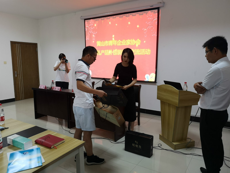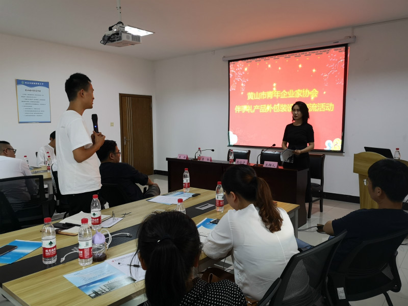 8月6日下午,伴手礼产品包装设计交流活动在黄山市新城创业大学举办。团市委副书记、黄山市青年企业家协会会长詹凯,黄山徽州竹艺轩雕刻有限公司总经理、黄山市青年企业家协会副会长朱伟,黄山市青年企业家协会会员企业代表30余人参加本次交流活动。
