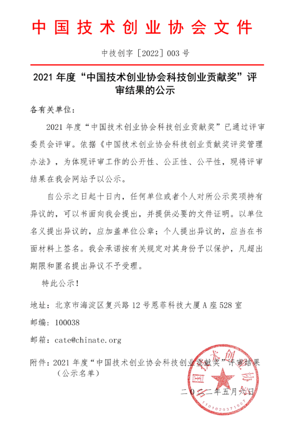 “科技创业贡献奖”是按照《国家科学技术奖励条例》,由国家科学技术奖励工作办公室批准设立,在创新创业领域有重大影响力的重要奖项,为我国科技创新创业事业树立标杆。