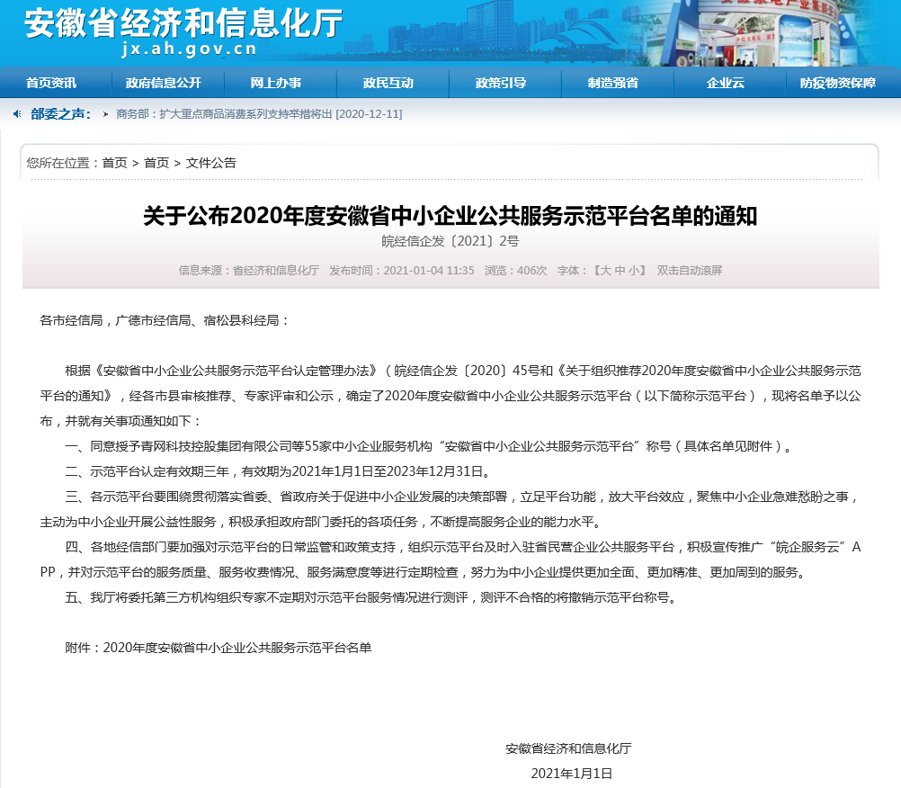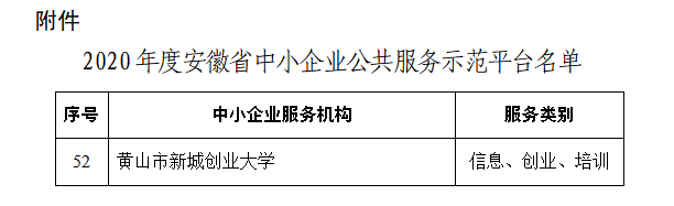 黄山市新城创业大学被认定为“2020年度安徽省中小企业公共服务示范平台”