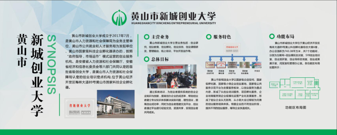 黄山市新城创业大学成立于2017年7月,是黄山市人力资源和社会保障局为业务主管单位黄山市人才发展服务局为发起单位、黄山科创高新技术创业服务有限公司承办的,按照“政府指导,市场运作”模式运营的创业服务机构。