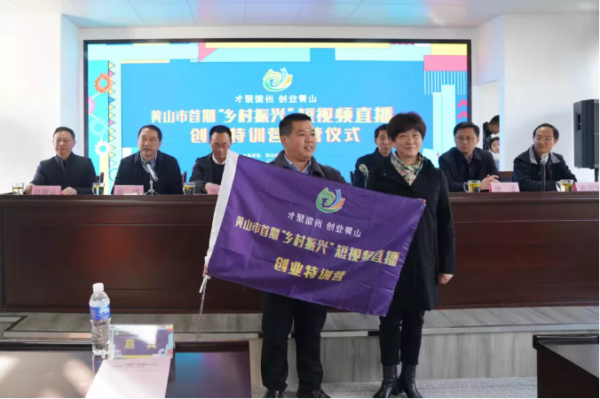 11月22日,由市人才发展服务局举办、黄山市新城创业大学运营的 “才聚徽州 创业黄山”--“乡村振兴”短视频直播创业特训营 在休宁乡村振兴农播讲堂(休宁县盐铺村村委会)正式开营。副市长程红宣布特训营开营,并为特训营班级授旗。省“四送一服”工作组第十六小组驻黄山工作组成员:张谷涛、曹富涛,休宁县县长唐进,市人力资源和社会保障局副局长范琪,市人才发展服务局局长姚剑平,黄山市新城创业大学校长江建云出席开营仪式。授课教师代表、特训营学员共40余人参加仪式。